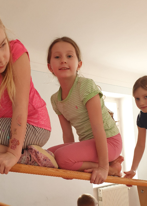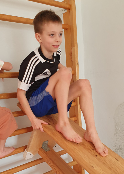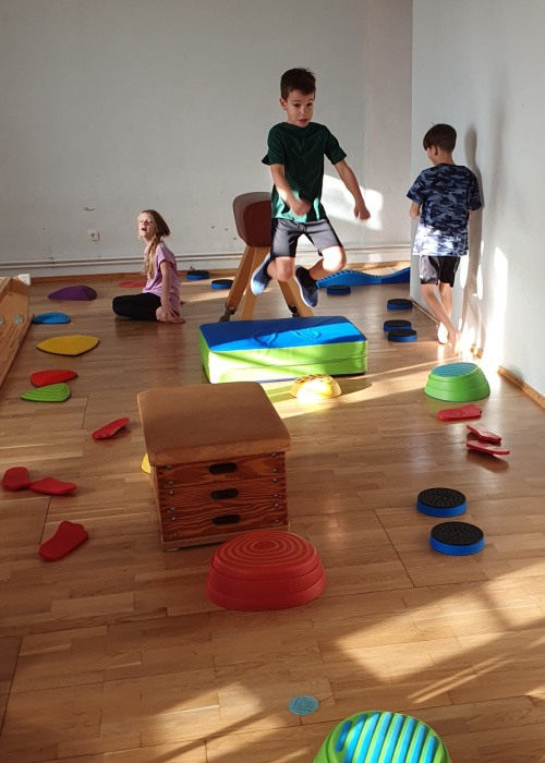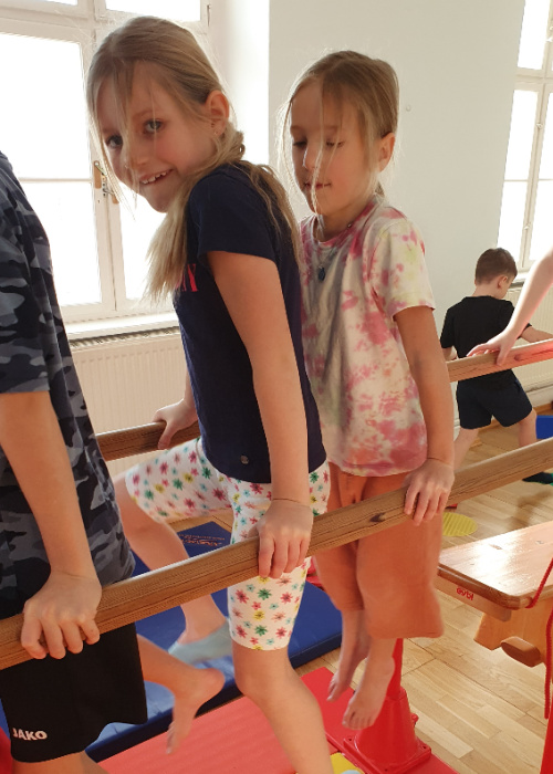 Ich mag besonders gerne einen bestimmten Parkours, er besteht aus vielen Langbänken. Besonders gerne laufe ich barfuß, weil am Boden gibt es viel Platten und Hütchen, die sind sehr angenehm.