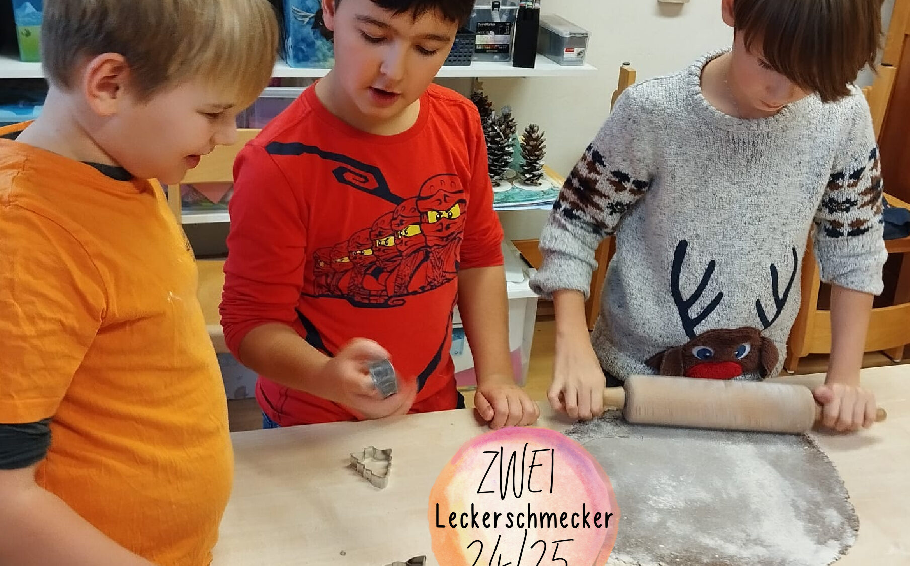 Ich walkte mit Tristan den Teig aus und er gab die ganze Zeit Mehl dazu. Dann war das irgendwann nur mehr Mehl, das war sehr lustig! Die Station Leckerschmecker machten die Mama von Rosalie und Severin, sie heißt Monika und Oksana, sie ist die Mama von Till und Karla. Dann verbrannten noch die Kekse, denn der Backofen im Dorfhaus ist anders als der zu Hause. Wir vverzierten die Kekse mit Schokoglasur.
