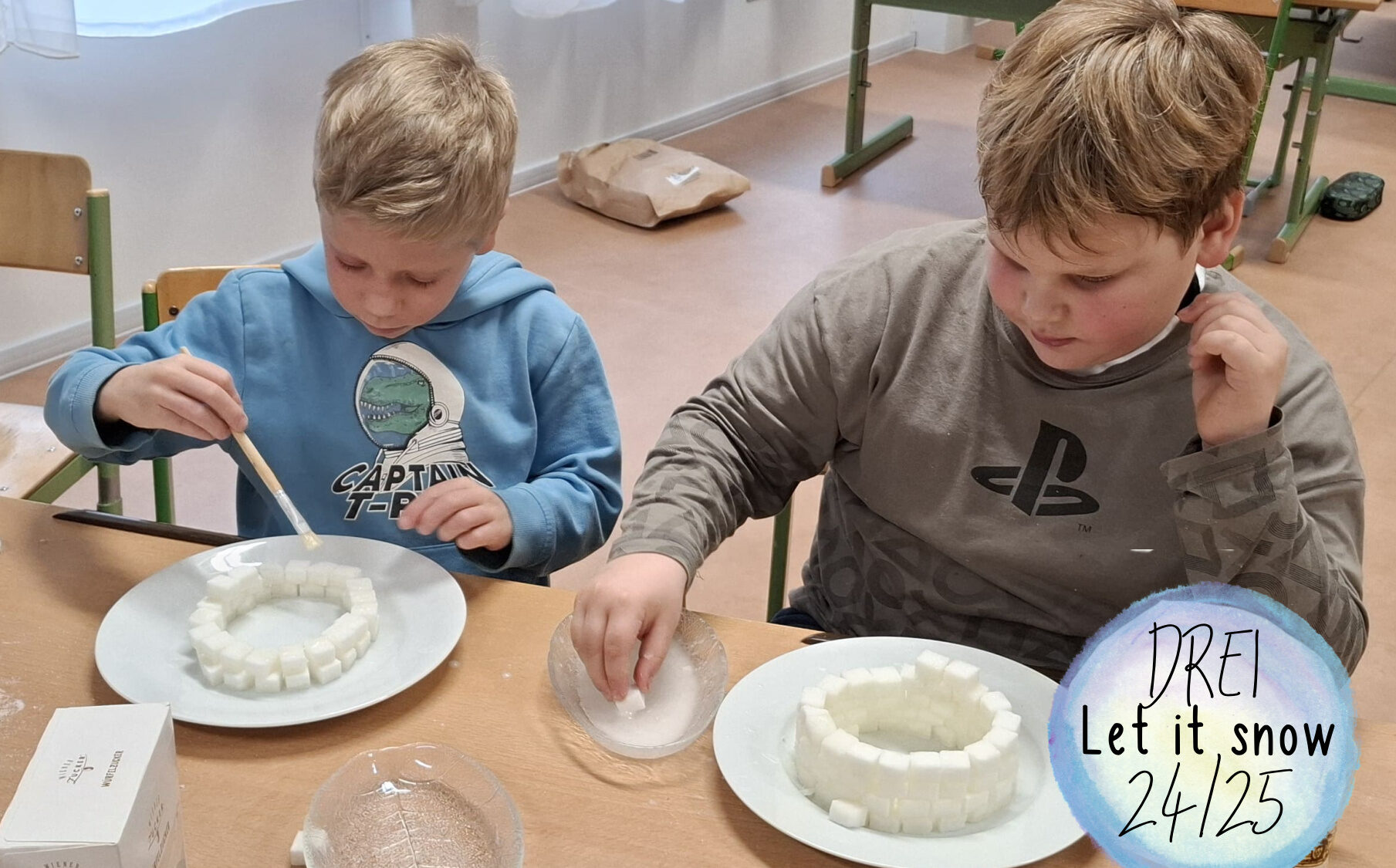 Wir basteln eine Schneekugel und bauen aus Zuckerwürfel mit Zuckerguss ein Iglu.