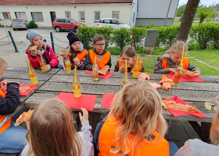 Beim Müllsammeln war Maxis Papa in meiner Gruppe. Wir sammelten sehr viel Müll. Wir teilten uns in drei Gruppen und gingen nebem dem Göllersbach. Wir hatten alle Warnwesten an und bekamen sogar Handschuhe. Das lange gehen war total anstrendend, aber zur Belohnung gab es dann Pizza.