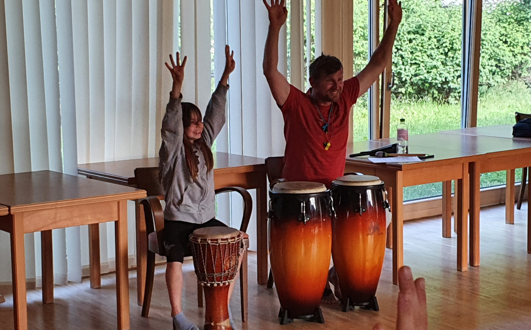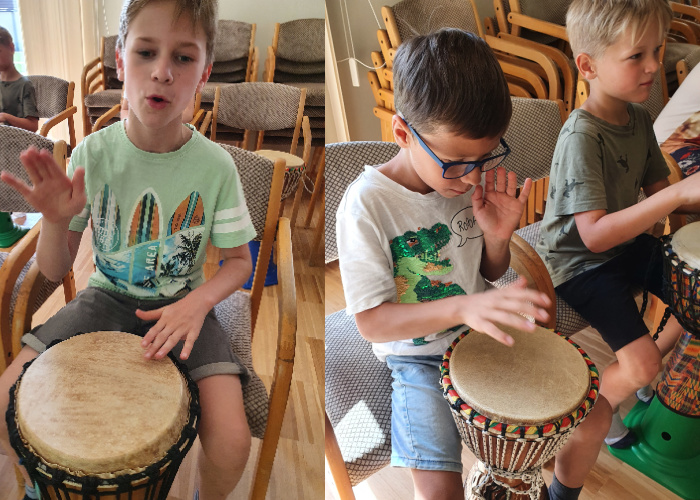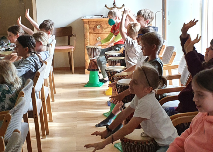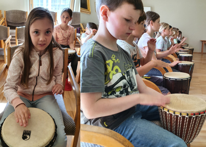 Beim Trommelworkshop übten wir viel, damit wir beim Schulfest gut waren. Beim Fest gab es dann gratis Wasser und Äpfel und natürlich ein riesiges Buffet. Hinter der Kirche war eine Hüpfburg, die sehr beliebt bei uns Kindern war.