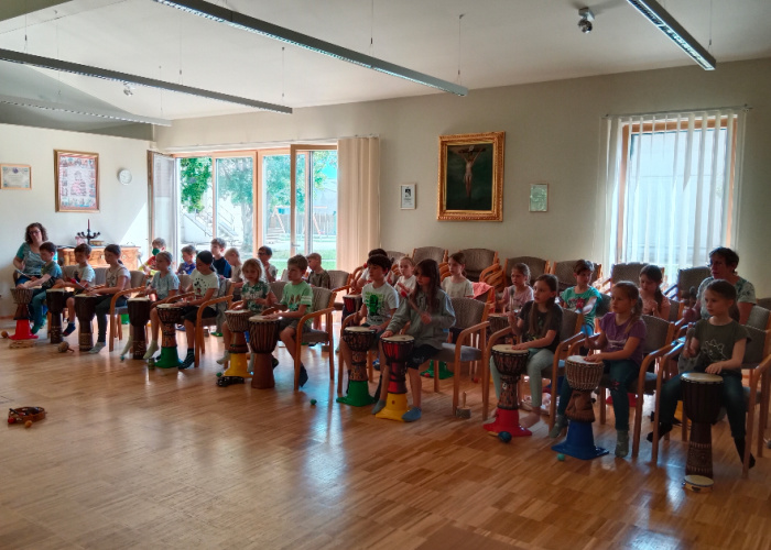 Am Freitag gingen wir gleich in der Früh ins Pfarrheim, da wartete schon der Trommler auf uns. Wir lernten zwei Schläge und eine coole Trommelstellung auf Kommando. Wir trommelten den Löwentanz und den Büffeltanz und dann war es auch schon wieder aus. Schade!