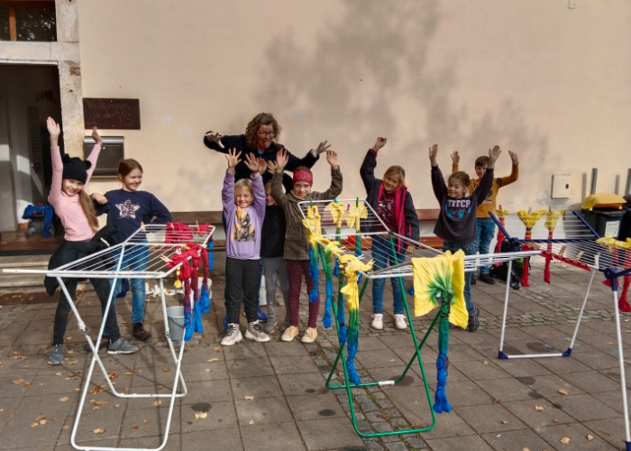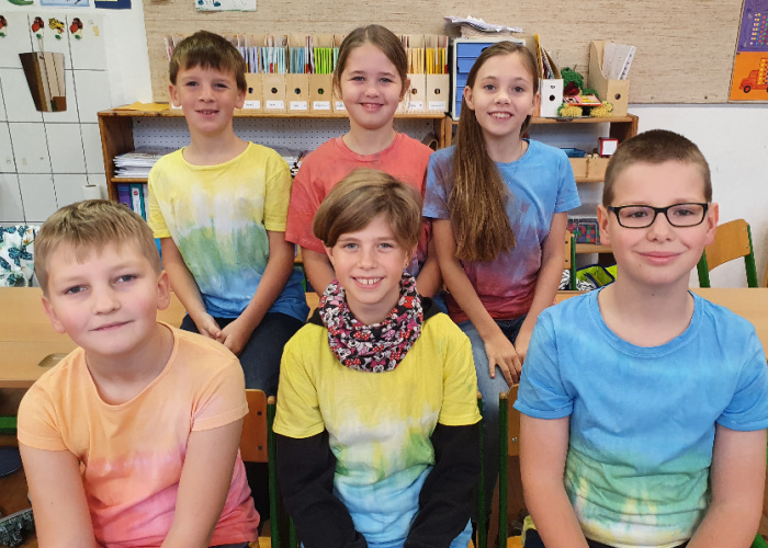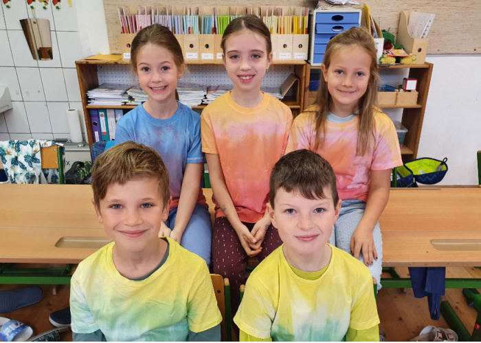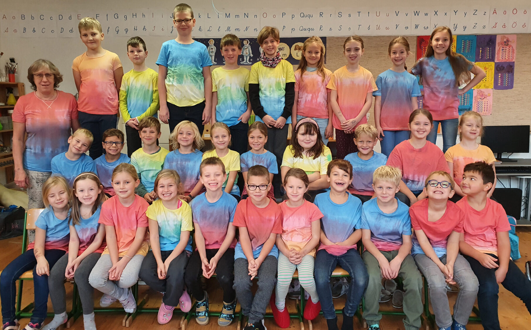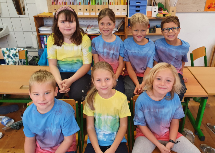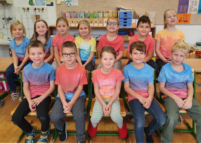 Zuerst banden wir die Leiberl zweimal ab. Dann entschied sich jedes Kind für zwei Grundfarben: Rot, Blau oder Gelb. Dadurch ergab sich in der Mitte eine Mischfarbe – Orange, Lila oder Grün. Obwohl die Leiberl kunterbunt sind, erkannt man dass wir zusammengehören.